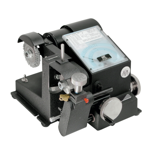 Simply insert the code card for the lock you are using and set the space needle to the number 1 mark on the card. Then turn the depth crank until the depth needle reaches the appropriate depth number. This action will move the blank into the cutter and make a cut to the proper depth. Next, back the key off of the cutter and move the space needle to the second space. Continue this simple procedure to cut a new key (to the manufacturer's exact specifications) in less than one minute.